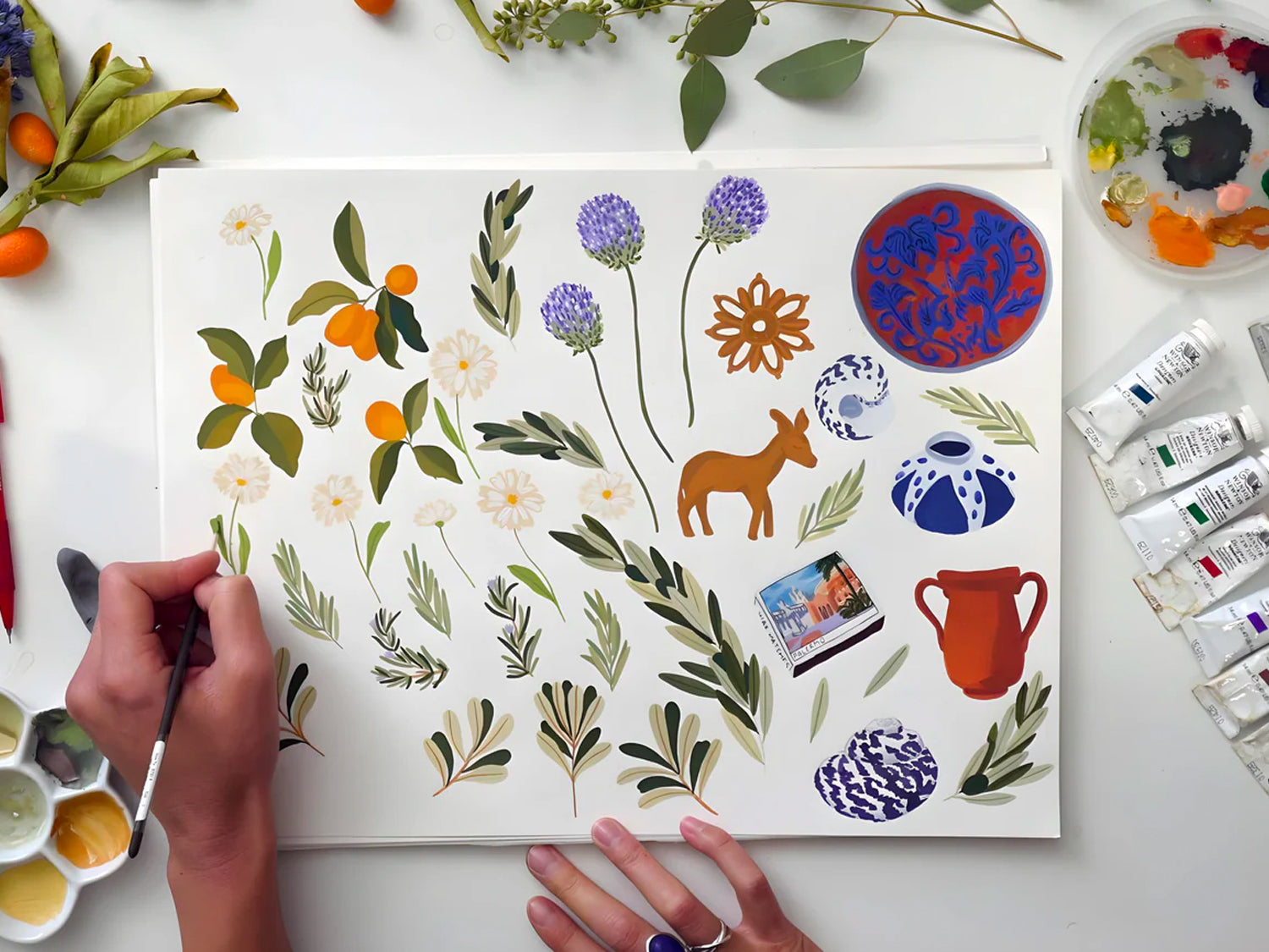 You’ll create a painted pattern inspired by a place you love with using real objects for inspiration, painting pattern elements with gouache, and arranging your elements into a repeating pattern in Photoshop.